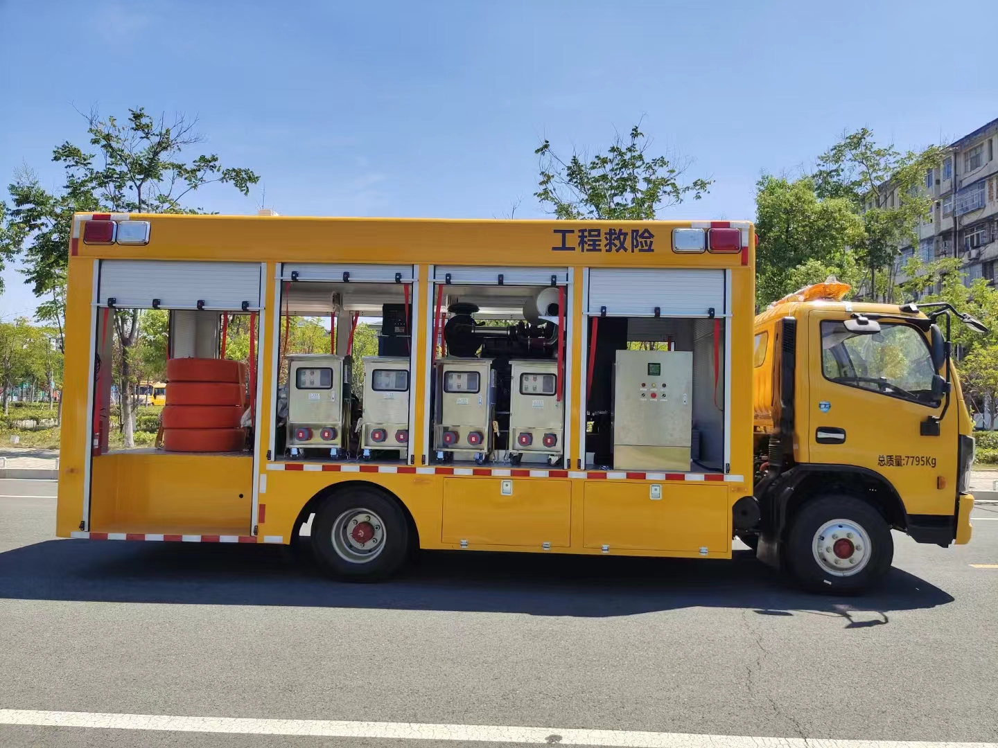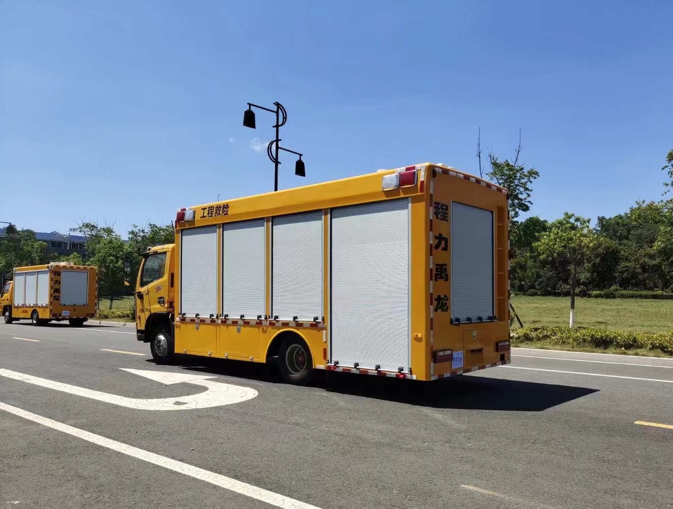 | 上装配置 | 1、厢体外形尺寸根据实际公告标准。 厢体:具备运输、防雨、防火、阻燃、防尘、防锈、降燥,隔震、长期抗震结构。外部钢材为优质冷轧钢板,表面处理平整,内衬优质冷轧钢板折弯骨架,强度牢固,配重合理。 2、厢体一体化钢体结构设计, 顶部平坦。厢体采用骨架式夹层形式,外蒙皮采用厚1.5mm优质防锈处理的汽车专用冷轧钢板,中间骨架采用防锈处理后的钢管焊接,顶层、侧围内、外层之间填充长时间使用对人体无害的防火阻燃环保吸音棉,外层铺盖一层阻燃金属布,内饰采用0.8mm厚网孔板。底板采用钢结构底框架,上表面铺厚2mm花纹钢板。 3、车辆厢体采用整体包覆式,厢体两侧下部设置裙边式,全封闭式结构,顶部为圆弧型,尾部有转向灯、刹车灯、尾灯、雾灯,箱体表面光滑平整。车厢靠驾驶室前部为休息室,休息室内带折叠坐椅及折叠桌,往后为机组室,机组室左、右侧布置进排风百窗,设置机组检修门一个,下置登车踏步梯,车厢后端为后为卷帘门。右侧排风百叶窗下部为维修观察舱门。左侧下围设置有工具箱及功能舱门等。右侧下围设置有汽车油箱舱、液压控制舱等。 4、车厢尾部配置标准储物货架让出水带、加长电缆等附件存放有序、互不干涉,让紧急排水抢险变得更加快捷、有效。 5、厢体喷漆:工程黄,与车头同一颜色; 6、最终的门数,形式,打开方式严格按照合同要求依据程力公告生产; | ||